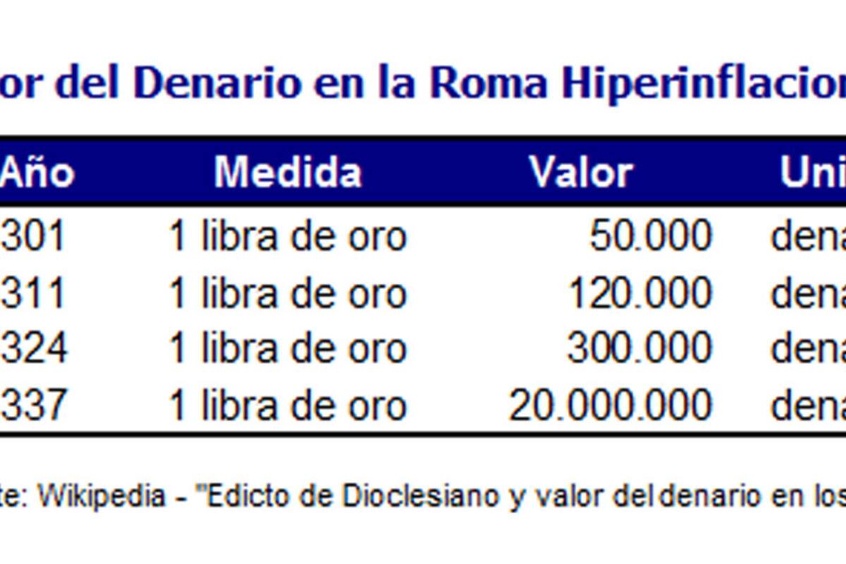 Podemos ver la decadencia del Imperio Romano por las tasas de hiperinflación que lo acompañaron: del 301 al 311 AD el incremento del oro fue de 140 % en denarios. Después entre el 311 y 324 AD, el incremento del oro fue de 150 % y por último entre el 324 y 337 AD, donde la libra de oro pasó a valer 20.000.000 de denarios y el incremento en esos años fue de 6567 % o sea en 13 años el incremento fue de 38,1 % anual, una cifra inmanejable que terminó de una u otra forma con la administración cotidiana del Imperio. Tras la caída del Impero Romano de Occidente, se trasladó a lo que hoy es Estambul (antes Constantinopla) y allí se reafirmó el nuevo Imperio Romano de Oriente, entre otros, con Constantino como emperador.