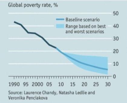 La pobreza está disminuyendo significativamente en el mundo como consecuencia del derrame del crecimiento económico sobre la situación social de los más desposeídos, como puede verse en el gráfico sobre la pobreza en el mundo entero, tomando del trabajo de Jeffrey Sachs, "Sustainable Development Goals for a New Era".