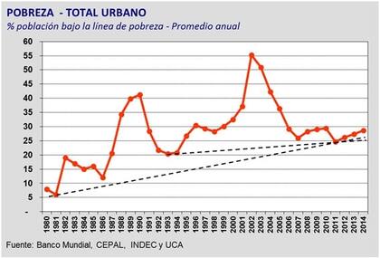 Si comparamos la cifra actual con el pico de pobreza en el momento del ajuste de Eduardo Duhalde en 2002, pico que fue de 56%, sí bajó la pobreza, pero ese no es un valor de referencia válido, pues es producto de una situación puntual de cambio de sistema monetario, maxidevaluación, licuación del gasto público por medio de un shock, de pesificación de los depósitos en dólares y de expropiación de todos los depósitos bancarios y su transformación en un bono estatal a cobrar en 10 años, de corralito de la economía y muchas otras arbitrariedades de las que no queremos acordarnos.