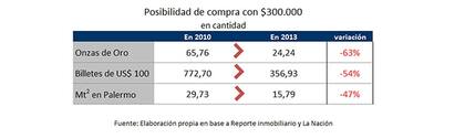 Si la medición quiere hacerse tomando los metros cuadrados que se podían comprar con ese dinero en el barrio porteño de Palermo en ese entonces y ahora, debemos tomar el dólar oficial para 2010 y el dólar celeste para 2013 (que sale del promedio del oficial y el paralelo), que es de 6.79 pesos. El cálculo nos dice que frente a 29,73 metros cuadrados que se podían comprar con 300.000 pesos (a un valor de 2603 dólares el metro cuadrado), ahora solo se puede acceder a casi la mitad: 15,79 metros cuadrados (a un valor de 2.800 dólares). La caída en la riqueza, medida en metros cuadrados, ha sido del -47%.