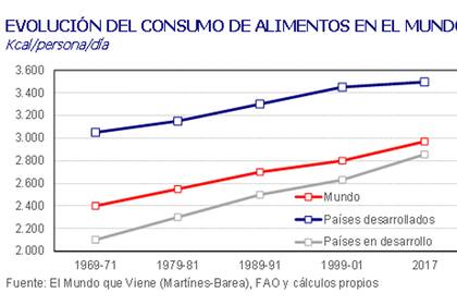 Por ahora, la evolución del consumo de alimentos en los países en vías de desarrollo está teniendo, en promedio, una evolución muy buena en los últimos 40 años, aunque esto no sea cierto para la Argentina, donde aumentó la pobreza a más del 30 % de la población total del país.