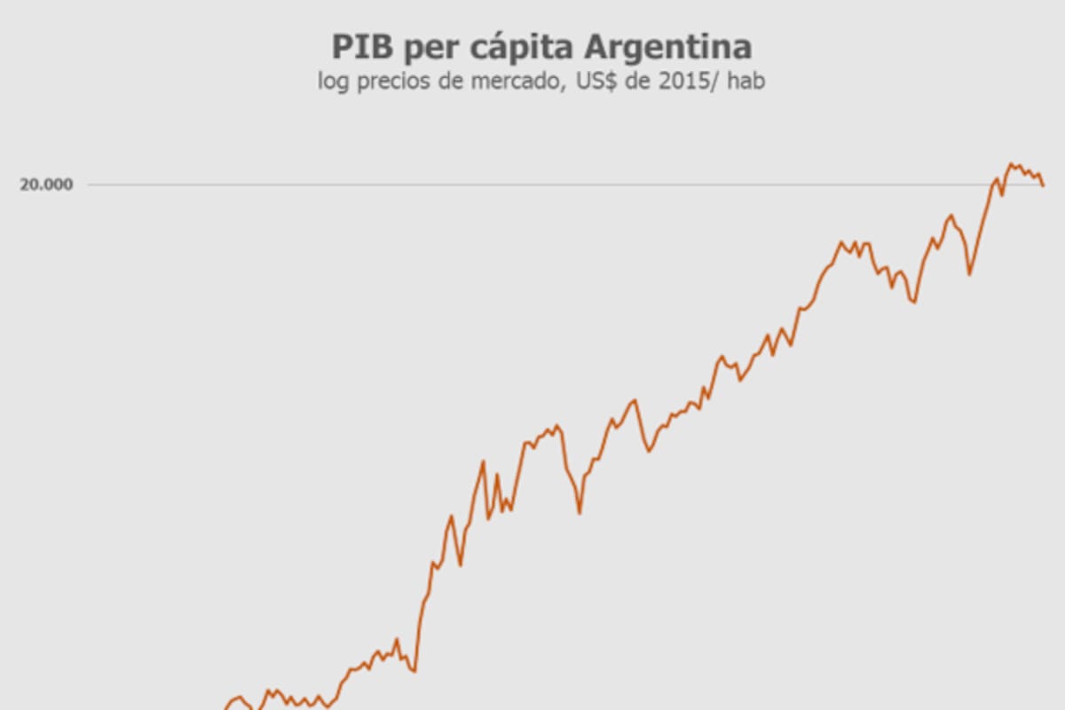 Desde 1931 hasta 2019, las inversiones sólo representaron el 18 % del promedio del PIB, es decir, la mitad de lo que habíamos invertido en la época en que llegamos a ser el octavo país del mundo. En esta segunda fase, vino también la idea de que consumir es lo más adecuado, por lo cual se incrementó el salario real y se consumió más, pero con el tiempo no se pudo crecer más que la pequeña proporción que indicaba la menor inversión sobre el PIB. Esto se puede notar en el PIB per cápita, que al estar en logaritmos mide, por su mayor o menor inclinación, las tasas de crecimiento de la riqueza de cada uno, en promedio.