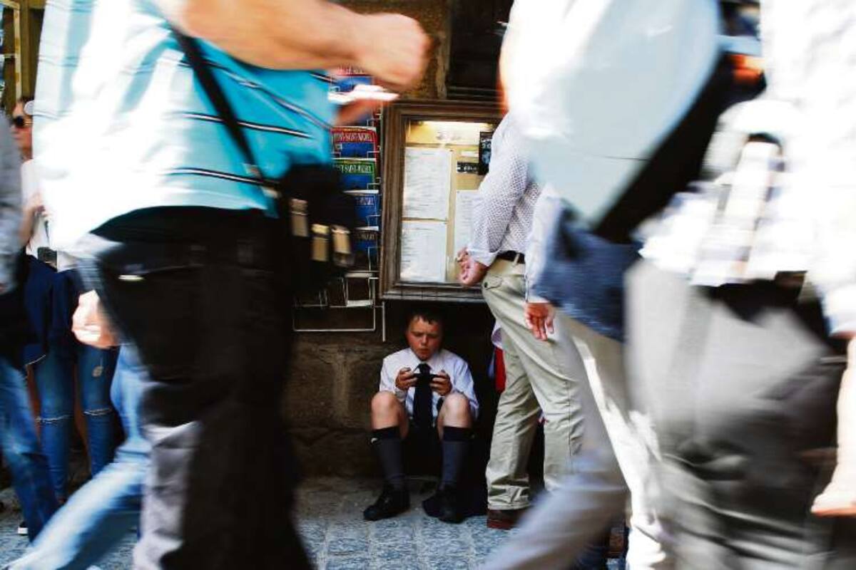 Ni el día de sol, ni la belleza de la abadía de Mont-Saint-Michel bañada por el mar, ni la promesa de aventuras en ese islote rocoso de la costa atlántica francesa logran que él suelte su celular. Mientras los turistas recorren las callecitas de esa joya normanda, él, a un lado del camino, parece refugiarse del ajetreo del mundo en su templo tecnológico. El atuendo lo delata: camisa y corbata, zapatos y medias altas, uniforme escolar. Justamente por temor a la competencia desleal de la tecnología en la lucha por la atención adolescente, el ministro de Educación de Francia prohibió este año el uso del celular en las escuelas. Sumergido en la pantalla, el chico parece darles la espalda a las maravillas del mundo. Sin embargo, ¿quién sabe? Tal vez lo agarramos en un alto en el camino, tal vez ya trepó todas las rocas. O tal vez mientras descansa está mirando las fotos que tomó en la abadía benedictina o en el antiguo molino de viento de Moidrey. ¿Quién sabe?