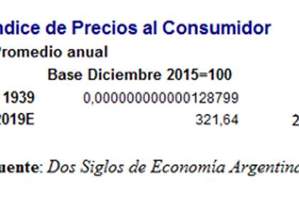 La inflación de los últimos 80 años ha sido de 249.723, 3 millones de millones porcentuales, es decir, la espantosa suma de 55,8 % promedio anual para este largo período, cercano a un siglo, contando que hemos tenido años con hiperinflación y otros con cero de inflación, como en algunos años de la convertibilidad. Para este ejercicio de 2019 estimamos que la inflación será de algo más de 50 % anual.