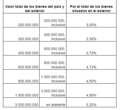 Supongamos que el contribuyente posee bienes en el país y el exterior, deberá guiarse por ambas tablas y calcular el impuesto, luego sumarlos y podrá saber cuanto deberá tributar por la tenencia de los bienes.