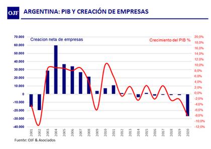 En el 2001 y 2002 la cantidad neta de empresas cayó en 15.000 y 20.000 firmas en cada uno de esos años respectivamente y el PIB también tuvo una fuerte recesión en esos períodos. En el gráfico se puede ver la evolución del PIB y la creación neta de empresas.