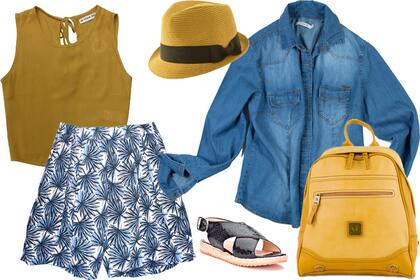 Crop top de Reina Ana $200 / Short de Inversa $359 / Sombrero de Compañia de sombreros $411 / Camisa de Try me $750 / Sandalias de Gemmes shoes $700 / Mochila de XL $615