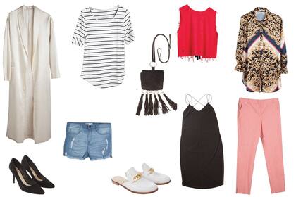 Kimono, Paula Cahen D´Anvers. Remera, Sail, $330 en Dafiti. Bolso de gamuza, $5200, Cher. Top de lino, $1690, Delaostia. Camisa de seda modelo Estribor, Uma. Zapatos, $1700, A pie by Grimoldi. Shorts, $690, Koxis. Zuecos, Lomm. Vestido, $2500, Chocolate. Pantalón, $1800, Lacoste.