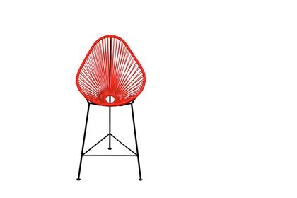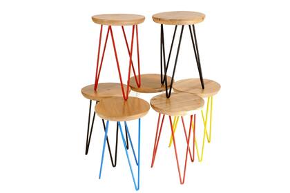 4) Bancos de madera Tri pata V, con asiento redondo de madera maciza y lustre natural. La base metálica está pintada de blanco, negro, gris, rojo, azul, verde o amarillo. 42cm de altura, $1440 (+iva), Unimate