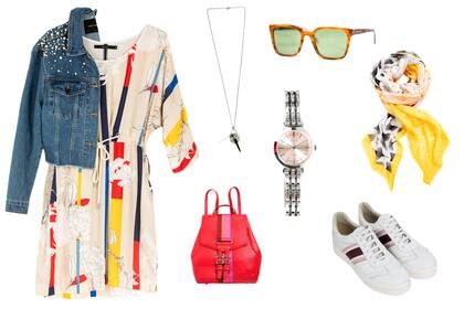 Look 2: campera de jean con perlas, Tucci, $4.080. Vestido, Perramus, $3.470. Mochila, Blaqué, $3.580. Zapatillas, Prüne, $3.490. Gafas de sol, Etiqueta Negra , $3.480. Pashmina, India Style, $950. Reloj, Prüne, $3.690. Collar, Paula Cahen D´Anvers, $950.