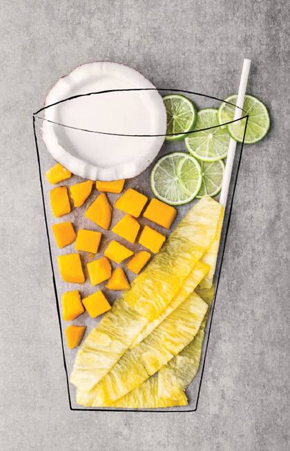 1/2 taza de leche de coco y un puñado de escamas de coco / 2 cucharadas de jugo de lima / 1/2 taza de mango / 1 taza de ananá