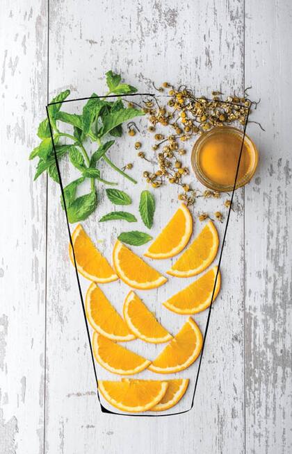 1 puñado de hojas de menta fresca / 1 saquito de té de manzanilla / 1 cucharada de miel / 3 rodajas de naranja / 1 cucharada de miel