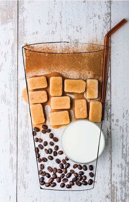 Mezclá bien 1/4 taza de dulce de leche con 1 taza de agua y colacá en una cubetera. Freezar toda la noche o hasta que esté todo bien firme. Mezclá el café con la leche, poné los hielos de dulce de leche en un vaso y espolvoreá con canela Serví bien frío.