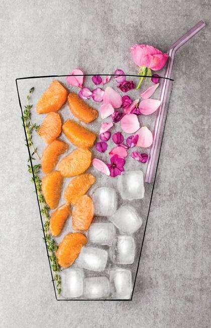 1 puñado de pétalos de rosas comestibles / 4 gajitos de tomillo / 1/2 pomelo rosado en gajos / 1/2 taza de hielo / 1/2 taza de agua