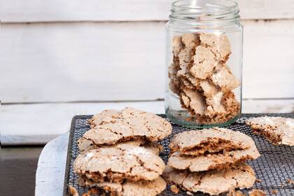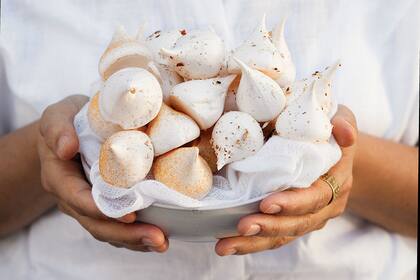 Precalentar el horno a 150 °C. Procesar las nueces súper finas y mezclar con el azúcar. Aparte, batir las claras a nieve hasta que estén firmes y luego mezclar ambas preparaciones con movimientos envolventes. En un papel enmantecado y enharinado, colocar de a cucharadas y llevar al horno hasta que los merengues estén bien secos. Si el horno es fuerte, dejarlo entreabierto.
