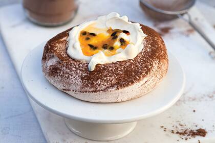 Batir las claras a nieve, luego agregar el azúcar, vinagre, maicena y cacao amargo y mezclar. Colocar la preparación sobre un papel manteca y darle forma redonda. Cocinar a horno suave hasta que esté crocante por fuera. Dejar enfriar y, una vez fría, agregar por arriba la crema y el maracuyá mezclado con un poco de azúcar.