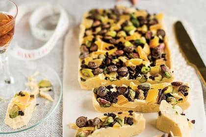 ¿Cómo se hace? Tostar los frutos secos durante unos minutos en un horno suave, hasta que estén crocantes. Dejar enfriar. Picar groseramente las frutas disecadas. Derretir el chocolate a baño María. Forrar un molde con papel manteca o papel film y untarlo suavemente con aceite o manteca. Volcar el chocolate blanco y distribuirlo bien. Agregar por encima los frutos secos picados. Dejar enfriar en la heladera y, al momento de servir, cortar en trozos medianos o llevarlo entero a la mesa.