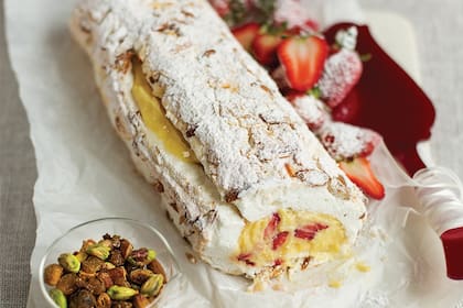 ¿Cómo se hace?Para la base. Batir las claras a nieve, sumar el azúcar y seguir batiendo. Incorporar el vinagre y el almidón y batir un rato más. Enmantecar y enharinar una placa de 20 x 30 cm y cubrirla con papel manteca. Verter la mezcla y esparcirla con una espátula. Poner por encima las almendras fileteadas y cocinar a horno bajo durante 25 minutos. Dejar enfriar y desmoldar sobre un papel aluminio espolvoreado con azúcar impalpable. Para el relleno. Colocar en una olla el azúcar, los huevos y el limón y cocinar sin dejar de mezclar hasta que tome cuerpo. Sacar del fuego y mezclar hasta que se enfríe. Poner el relleno sobre la base sin llegar hasta los bordes. Poner por encima las frutillas fileteadas y enrollar, ayudándote con el papel aluminio. Llevar al freezer por 4 horas y servir.
