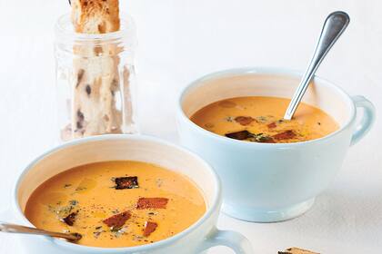 Servir la sopa con un poco de calabazas cortadas en cuadrados y dorados en aceite de oliva.