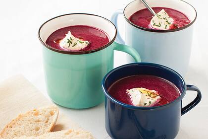 Lavar las remolachas y cortarlas en cuartos. Pelar las cebollas y cortarlas también en cuartos. Pelar los dientes de ajo. Colocar todos los ingredientes en una fuente de horno profunda, tapar con papel aluminio y cocinar en horno medio hasta que las remolachas estén tiernas, 35 minutos aproximadamente. Volcar toda la preparación en una licuadora y procesar hasta conseguir una crema homogénea. Se puede servir fría o caliente con queso crema con hierbas.