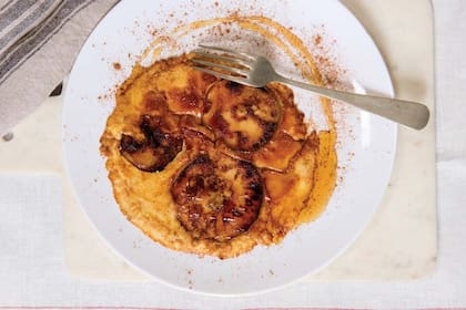 ¿Cómo se arman? Colocar manteca en una sartén y agregar las manzanas hasta que tomen algo de color, espolvorear con azúcar y luego agregar la mezcla de crêpes por arriba con suavidad hasta cubrir por completo las manzanas. Cocinar en una sartén de ambos lados, sin que se sequen demasiado. Dar vuelta directamente sobre el plato elegido y terminar el panqueque con miel y canela.