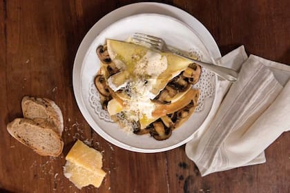 ¿Cómo se arman? Primero, picar la cebolla y el ajo bien chiquitos; después, dorar en una olla o sartén grande, agregar los hongos y cocinarlos por unos minutos. Agregar perejil picado y salpimentar. Rellenar los crêpes, previamente entibiados en la sartén, con el ragú de hongos caliente y un pedazo de brie y, por último, servir con un chorrito de crema de leche caliente.