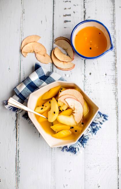 2 mangos, 2 manzanas, 1 maracuyá, 100 g de azúcar, helado de crema, chips de manzana.