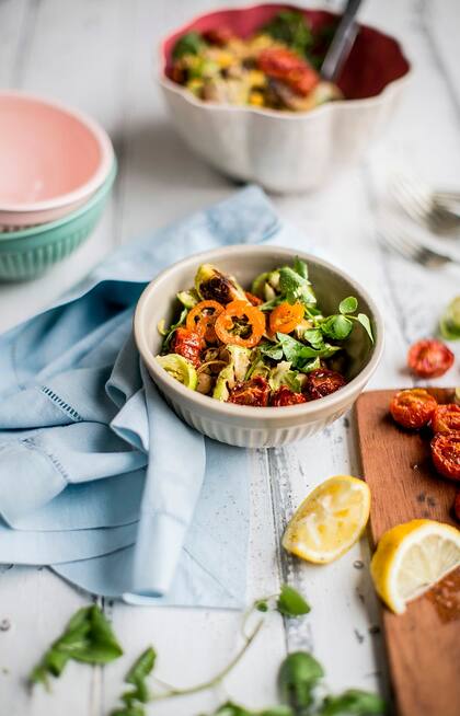 Dejar en remojo el día anterior las lentejas, los garbanzos y los porotos de soja. Al día siguiente, cocinarlos en abundante agua con sal hasta que estén tiernos. Hervir el choclo y desgranarlo. Luego, cocinar los repollitos de Bruselas en sartén por todos sus lados. Cortar los tomates al medio, ponerles un poquito de azúcar y cocinarlos en horno suave por 45 minutos. Limpiar el berro y armar el bowl con los granos, las verduras cocidas y las hojas de berro. Condimentar con limón, chile y aceite de oliva.