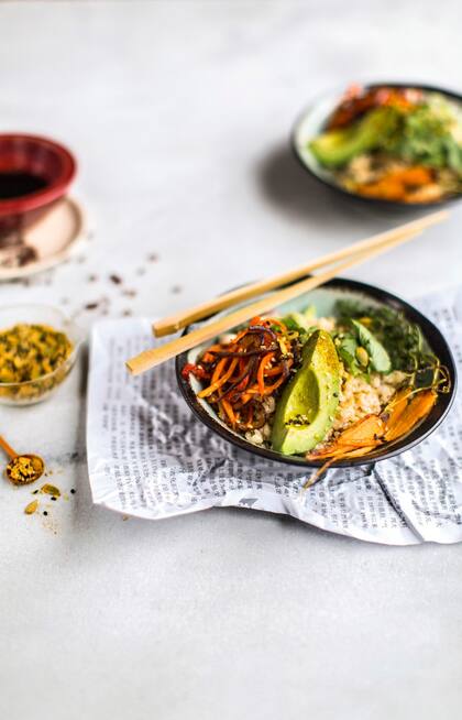 Armar el bowl poniendo el arroz en la base, un poco de los vegetales dorados, la palta, el cilantro y las semillas tostadas. Servir con salsa teriyaki.