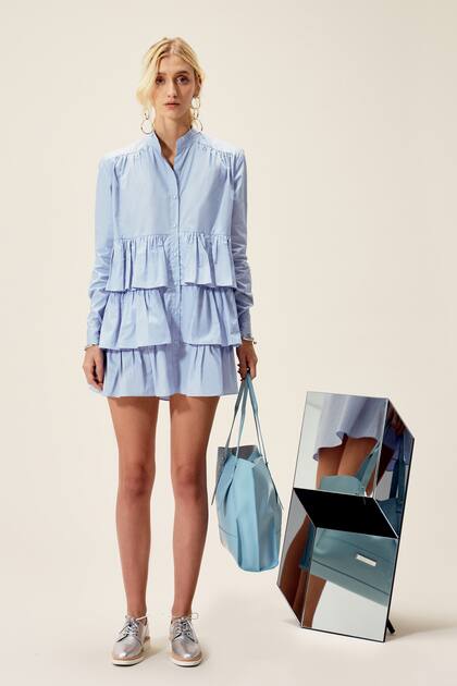 - Una camisa con volados adquiere una impronta de femineidad que la diferencia del modelo de cuello y botones clásico. Vienen con volados por debajo de los hombros, en el caso de los modelos off-shoulder, o pueden estar ubicados de la cintura para abajo, como en el caso de este vestido camisero. El efecto es bohemio y romántico, por eso quedan muy bien en tonos lisos y pastel, como celeste, rosa, amarillo claro y blanco.