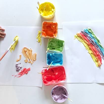 Para los más grandes, de 3 en adelante, con pocos materiales se puede crear la "pintura nube", como la bautizamos en casa. Consiste en mezclar bien mitad cola vinílica y mitad espuma. Una vez que estén bien integrados hay que separarla y agregarles colorante de comida. Como la base es blanca quedan en tonalidades pasteles, para colores más intensos vas a tener que agregar más colorante.