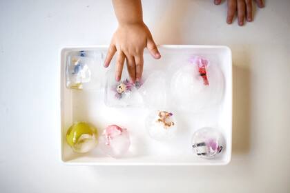 Seguro tenés por tu casa muñequitos chiquitos dando vueltas por ahí. Juntalos y ponelos en contenedores plásticos de tamaños acorde. Tené en cuenta que no sobresalgan para poder esconderlos en el hielo. Llená cada recipiente con agua y llevalos todos al freezer. Al día siguiente desmoldas todo y los chicos pueden jugar con los hielos mientras se derriten y encuentran sus juguetes. Podés hacerlo en alguna palangana o directamente adentro de la bañadera.