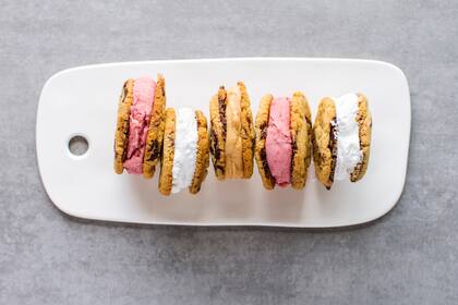 Batir las claras a nieve y agregar el azúcar de a cucharadas hasta formar un merengue bien firme. Luego, sumar de a poco el yogur y mezclar con movimientos suaves hasta incorporarlo todo. Si querés saborizar el yogur helado, este es el momento: podés sumarle a la preparación dulce de leche o mermelada de frutos rojos y mezclar bien. Llevar al freezer de 8 a 12 horas hasta que esté firme. Luego, poner cucharadas del helado de yogur sobre la mitad de las galletitas y tapar con el resto. Volver a llevar al freezer hasta servir.