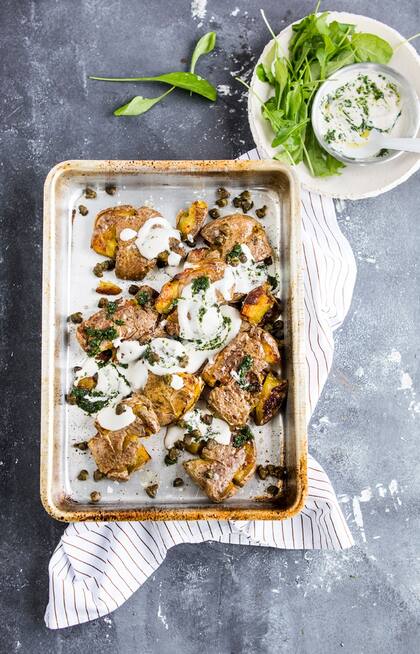 Precalentar el horno a 220 °C. Cocinar las papas en una olla con agua hasta que estén tiernas. Colar y dejar enfriar. Aplastarlas, ponerlas en una placa para horno y rociarlas con aceite de oliva, sal y pimienta. Asar durante 30 minutos, darlas vuelta y sumar las alcaparras por encima. Cocinar por 10/15 minutos más hasta que estén bien doradas y las alcaparras, crocantes. Mezclar el yogur con el tahíne y 1 cucharada de jugo de limón. Por otro lado, hacer una salsa verde con el perejil y la menta picados y 2 cucharadas de jugo de limón y oliva. Servir las papas tibias con el yogur, la salsa verde, las alcaparras y rúcula.