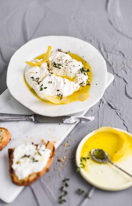Colocar el yogur y una pizca de sal en un lienzo fino (también llamado tela pañal), sobre un colador en un bol. Presionar suavemente el yogur contra el lienzo y dejar en la heladera durante 48 horas para que el suero drene bien y el yogur se espese. Retirar y colocar en un bol o plato. Marinar con aceite, pimienta, ralladura de limón y hojas de tomillo. Servir en tostadas o crackers.