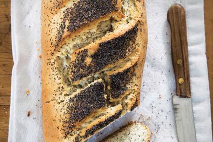 Colocar la harina, el azúcar, la sal, las semillas de amapola y las pasas de uva en un bol, y hacer un hueco en el centro. Incorporar allí la levadura y agregar un poco de leche tibia para formar la esponja. Mezclar la manteca con el resto de la leche tibia y, una vez formada la esponja, ir vertiendo de a poco este líquido a la preparación y amasar hasta lograr una masa suave y homogénea. Luego, colocar la masa en un bol, tapar con un repasador y dejar leudar hasta que duplique su volumen. Desgasificar, amasar un poco más, ponerla en un molde rectangular y dejar leudar nuevamente. Hacer pequeñas incisiones de 3 cm de largo con un cuchillo en la superficie, humedecer con unas gotas de agua y espolvorear con semillas de amapola. Hornear de 30 a 40 minutos. Por último, dejar enfriar sobre una rejilla.