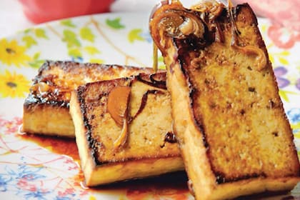 Hacer una marinada mezclando la salsa de soja, el aceto, la miel y el romero. Cortar el tofu en rodajas y sumergirlas en la preparación de 4 a 6 horas. Luego, sacarlas y dorarlas junto con la cebolla, de ambos lados en una sartén.