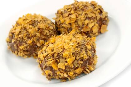 Bañar los bizcochitos con el chocolate y adornarlos con los cereales
