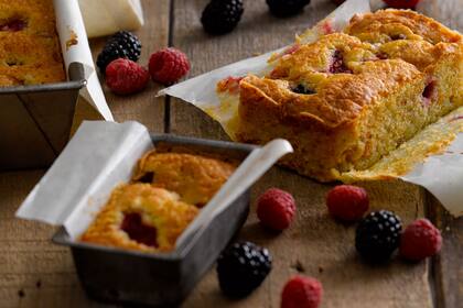 Batir la manteca blanda con el azúcar impalpable hasta obtener una preparación pálida y cremosa. Incorporar la ralladura, el jugo de limón y los huevos de a uno, mezclando bien después de cada adición. Por último integrar la harina, las almendras procesadas, las frambuesas, las moras y el chocolate picado, suavemente con espátula para no romper las frutas. Verter la preparación en moldecitos para budín forrados en papel manteca lubricado con rocío vegetal. Cocinar en un horno precalentado a temperatura media (180°C) durante 50 minutos aproximadamente.