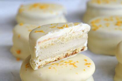 Una vez congelados bañarlos en chocolate blanco templado, trempar y dejarlos enfriar en una bandeja o placa con papel manteca o encerado. Por último, espolvorear con la ralladura deshidratada.
