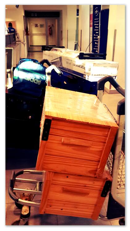 Desarmamos cajas de cartón, reorganizamos todo en valijas y cajas de madera y en el aeropuerto nos dijeron: "¿Y ese teclado? ¿Qué más llevan de electrónica?"