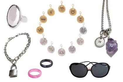 Anillo metal $225 María Rivolta / Dijes zodiacales $85 cu María Rivolta / Collar dije y piedra $315 Dame Bola / Gargantilla candado $90 Dame Bola / Dúo de anillos de piedra $220 Kona Queen / Anteojos de sol $450 Fight for your right /