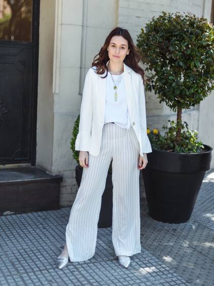 En resumen, tenemos un look que en su gran porcentaje es de color blanco, con prendas clásicas como un blazer, sólo que con un touch especial y lo levanto con accesorios, un mix con dorado y plateado, tanto en collar como en zapatos.