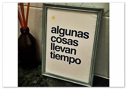 Unos días después me invitaron a un evento. Apenas llegué al espacio, pasé al baño. Al entrar, lo primero que atrajo mi atención fue un cuadrito de esos muy Pinterest que decía “Hay cosas que llevan tiempo”. Reí para mis adentros y le saqué una foto. Ya integrada en la escena del lugar, y mientras escuchaba a un chico con voz de chica cantar estupendamente “Change” de Blind Melon, otro cuadrito captó mi atención. En este caso la leyenda decía “Menos pensar, más actuar”. De nuevo, risas en mi cabeza.