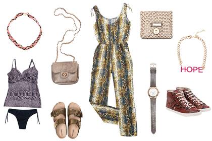 Enterito (Basement, $699), tankini estampado (Soly Oro, $325), minibandolera (XL, $530), botitas (Coca-Cola Shoes, $999), sandalias (Hush Puppies, $950), monedero (XL, $98), collar (Peuque, $120), pulsera (Todo Moda, $95), reloj (XL, $638)