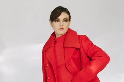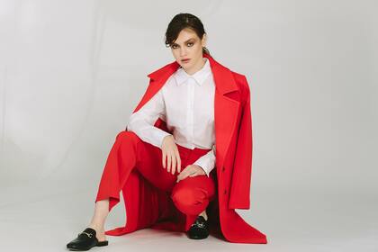 Todo conjunto impecable de oficina comienza con una camisa blanca. En este caso elegimos la de Clara Ibarguren con puños XL, camisa Breaking Bad, como base neutra para combinar con rojo en todo lo demás: el pantalón de traje y el abrigo. El modelo sastrero de corte oxford en tela plana, de tiro medio con recortes laterales de satén se llama New Budapest y es de Paula Cahen d A'nvers, más el tapado Scarlet de Portsaid. En los pies, cierran unos mocasines Ambra de Prüne con herraje y talón al descubierto.