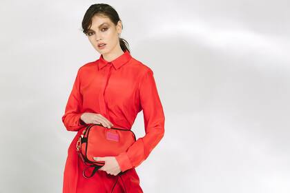 El color de las revoluciones también es capaz de cambiar la energía de cualquier conjunto. Contrasta con el gris de la ciudad, sacudiendo la monotonía. También vale para la noche. Para un cóctel o una fiesta, vestido corto Atuel de Vitamina, de mangas largas con volado, en satén ultra-liviano con efecto mate. Con la bandolera Party de Besha es un fuego.