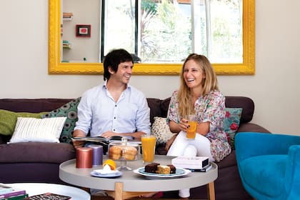 Un olivo, un limonero, una Eugenia, cañas de bambú, enredaderas. Las plantas que compraron inmediatamente después de mudarse crecieron y hoy, desde el living, la vista es de una pared verde y fresca que, además, les da intimidad. Allí, si es verano, prenden la parrilla y llegan amigos de ambos lados. "Nos encanta presentar gente y que se conozcan. Hacemos reuniones todos los fines de semana", cuentan. El balcón, con una de las mejores orientaciones (hacia el Noroeste), tiene todo para recibir visitas: dos sillas Acapulco (MercadoLibre, desde $800), un sillón hecho con elementos de demolición y una mesa de madera y hierro ($4500 el juego, en el Mercado de las Pulgas). Al asiento le dieron vida con dos almohadones modelo Bolivia (Salmón Tienda, $770) y otro amarillo de Chirola Cool Things.