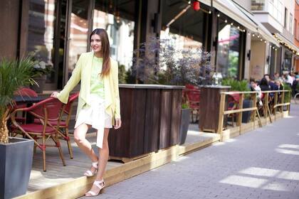 Bueno, en este caso los protagonistas son justamente las prendas con asimentrías. Por un lado, el blazer en color amarillo lima que tiene solapas en punta, tanto adelante como por detrás. Por el otro, la falda con recortes y largos desparejos en el frente, efecto que también se logra a través del cinturón que ya viene integrado.