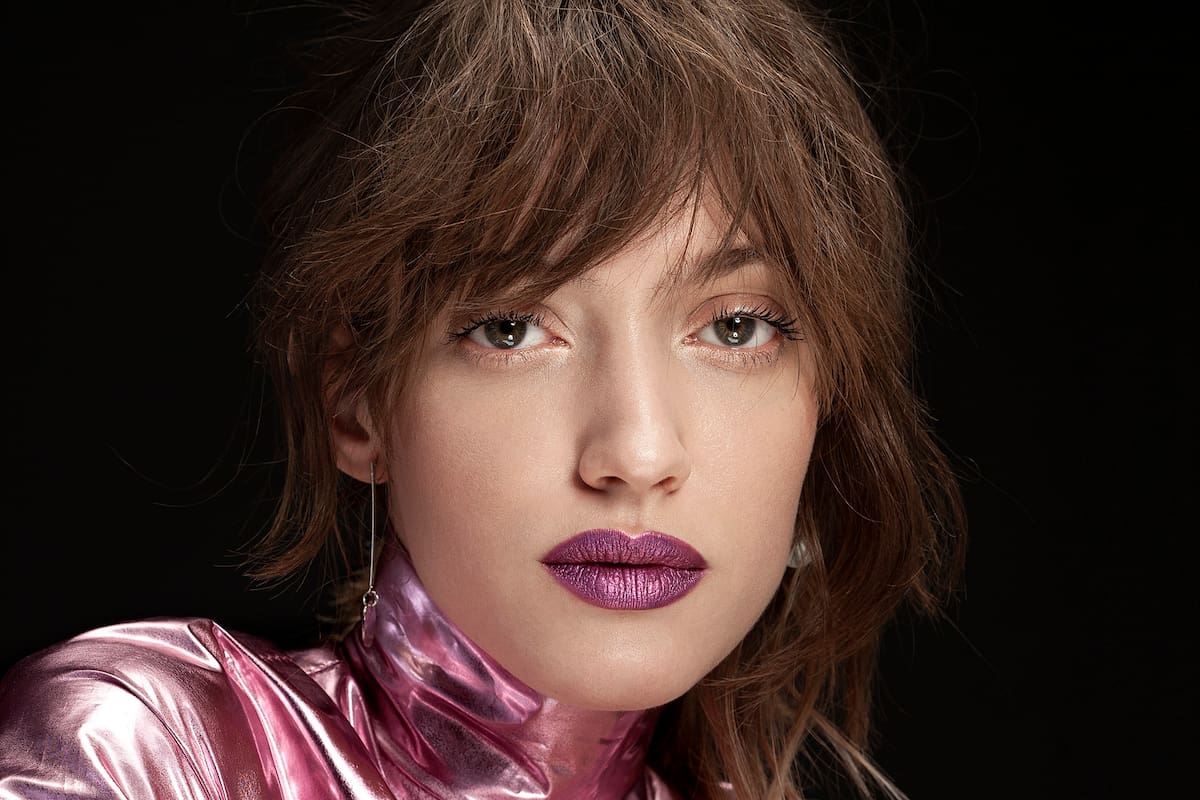 - 5. En este look, toda la atención va a la boca. Maquillala de manera uniforme con un labial metalizado color rosa.